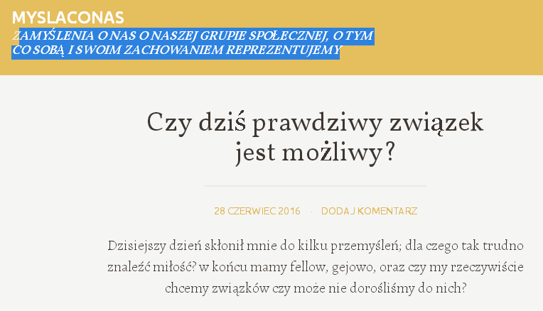 Osobiście nie wierzę w coś co autor nazywa związkiem. Najwyraźniej jestem ograniczonym człowiekiem, który ma jeszcze zbyt małe horyzonty by zrozumieć co takiego samotni poszukiwacze rozumieją pisząc "szukam kogoś do związku" bo mi się to kojarzy z chodzeniem po targowisku i szukaniem konia z białymi zdrowymi zębami.